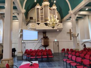 ,,Twee jaar geleden hebben we nagedacht over de toekomst van het kerkgebouw. Je wordt dan letterlijk even stilgezet. Onze leden zijn gemiddeld tussen de 70 en 85 jaar en als je dan 15 jaar in de toekomst springt… dan is de kerk er waarschijnlijk niet meer. Dat is heel confronterend. We hebben na een grondige renovatie een stichting opgericht om het voortbestaan van het kerkgebouw te borgen. Die stichting verhuurt de kerkruimte voor allerlei activiteiten: cultuur, trouwen, noem het maar op. De kerkzaal is daarvoor heel geschikt: het is een multifunctionele ruimte geworden met stoelen in plaats van banken. De vloerverwarming verving de radiatoren en als je nu de stoelen er allemaal uit haalt, heb je een heel mooie, grote open ruimte.”